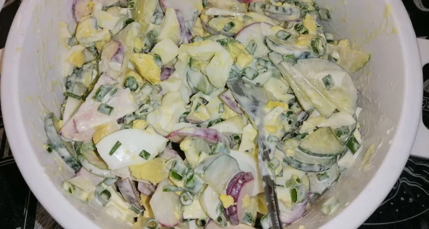 Так же в сезон в этот салат можно добавить свежую редиску и свежий огурчик, предпочтительно из собственного огорода. Они придадут салату дополнительный хруст и освежающий вкус.