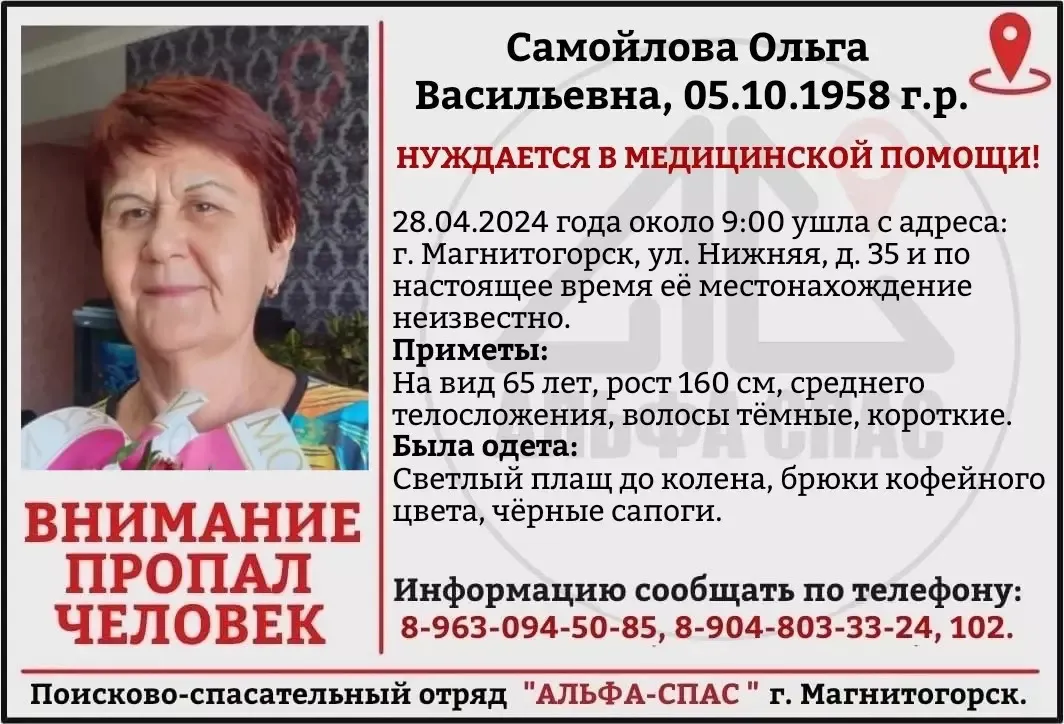 В воскресенье утром, 28 апреля, в городе Магнитогорске исчезла 65-летняя пенсионерка по имени Ольга Самойлова. Женщина нуждается в медицинской помощи, и о ее исчезновении стало известно благодаря активности волонтеров в социальных сетях.