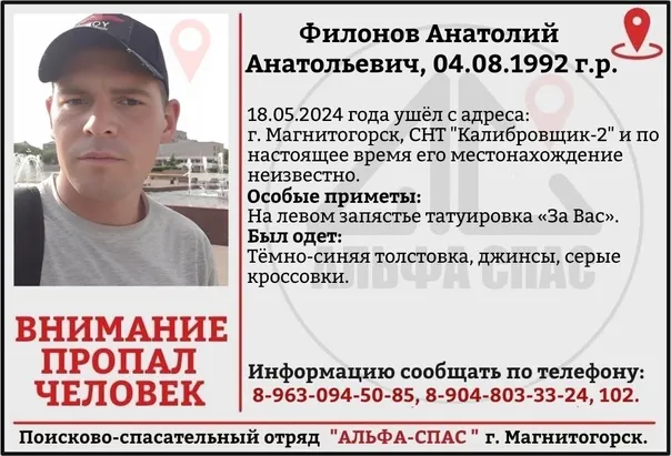 Если вы обладаете какой-либо информацией о местонахождении Анатолия Филонова, просим сообщить: