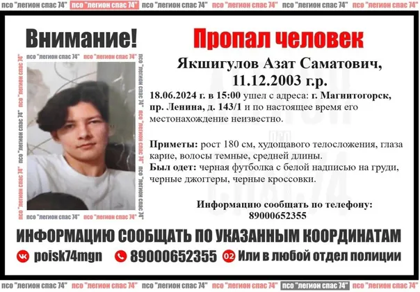 Семья тревожится, поскольку он ушел с адреса Ленина, 143/1 в три часа дня и не вернулся. До сих пор местонахождение Якшигулова остается неизвестным. Поисковые отряды опубликовали черты пропавшего: он ростом 180 см, худощавого телосложения, с карими глазами и темными волосами средней длины. В момент исчезновения он был одет в черную футболку с белой надписью, черные джоггеры и черные кроссовки.