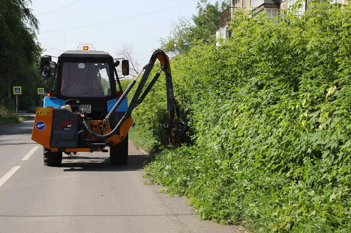 В Магнитогорске активно облагораживают приросшие кустарники и косят заросшую траву. После обильных дождей трава начала быстро расти, и чтобы город не превратился в зеленые заросли, кустарники аккуратно подрезают, а высокую траву косят.