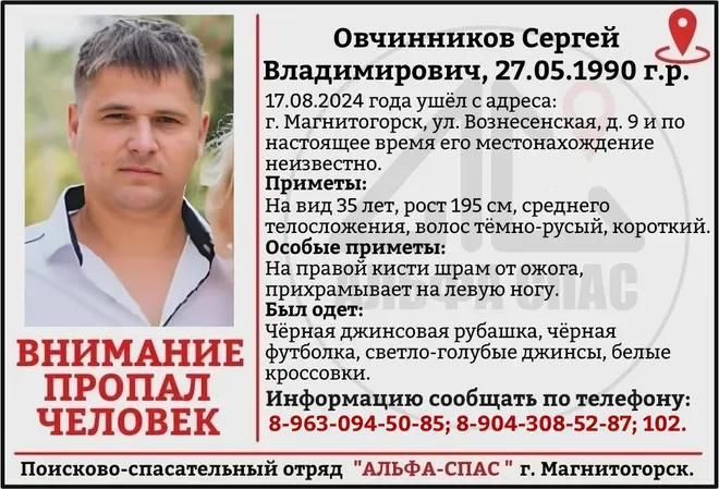 В Магнитогорске продолжаются поиски 34-летнего Сергея Овчинникова, пропавшего без вести 17 августа. Информация о его исчезновении была размещена в группе волонтёров ПСО «Альфа-Спас».