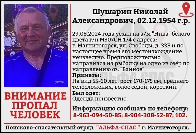 В Магнитогорске продолжаются поиски 69-летнего пенсионера Николая Шушарина, который бесследно пропал после того, как отправился на рыбалку. Мужчина уехал на своей белой «Ниве» к одному из озер в районе Банного и с тех пор о нем ничего не известно.