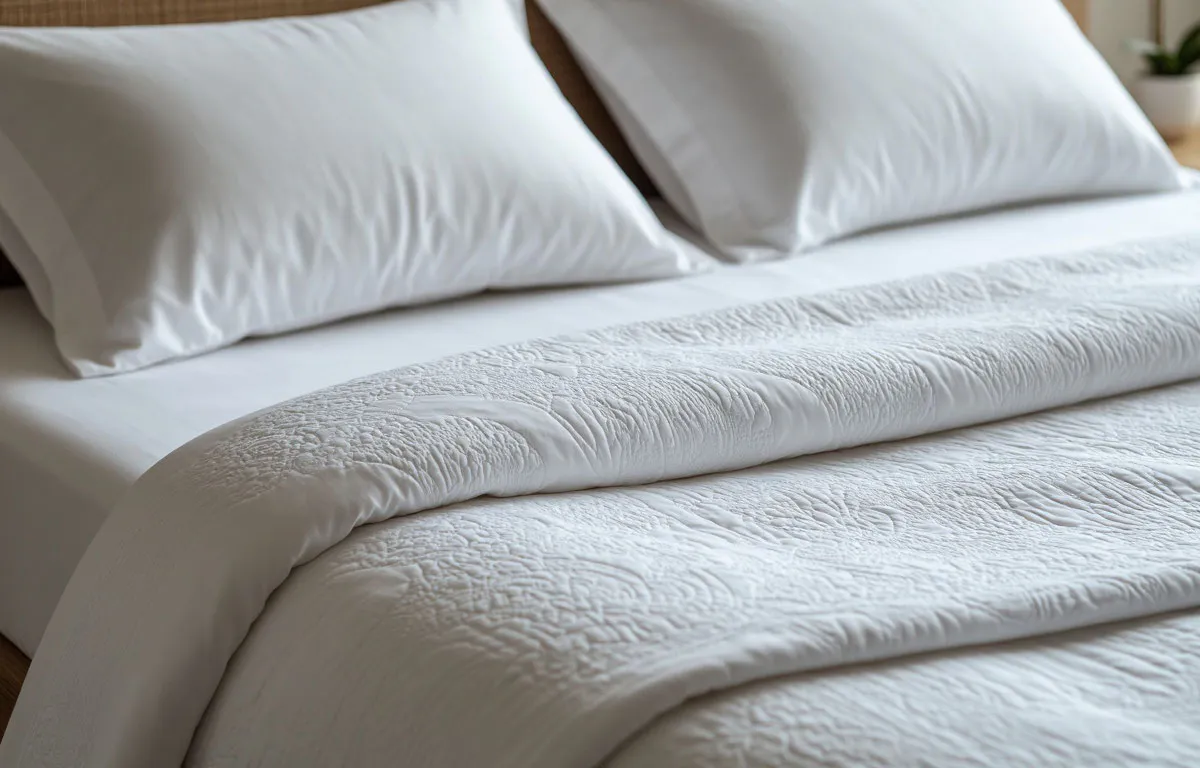 Тренды подчеркивают экологичность и тактильные качества волокон. Варёный хлопок выделяется своей непритязчивостью: после стирок он приобретает бархатистость, напоминая любимый свитер. Бамбук удивляет шелковистостью и способностью впитывать до 60% больше влаги, чем обычный хлопок — идеально для влажного климата или знойных ночей. Сатин из египетского хлопка дарит ощущение роскоши благодаря естественному блеску и гладкости, не скользя по простыням.