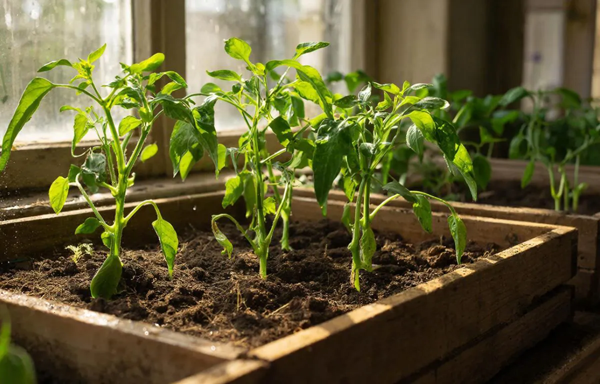 Дневная теплота 20-25°C, ночная не ниже 18°C сочетается с умеренным поливом теплой водой и опрыскиванием для влажности без сквозняков. Обязательна досветка фитолампами после всходов, поворачивая ящики для равномерности. Подкормки калийными комплексами стартуют через 14 дней, чередуя с настоем коровяка или яичной скорлупы дважды в месяц.