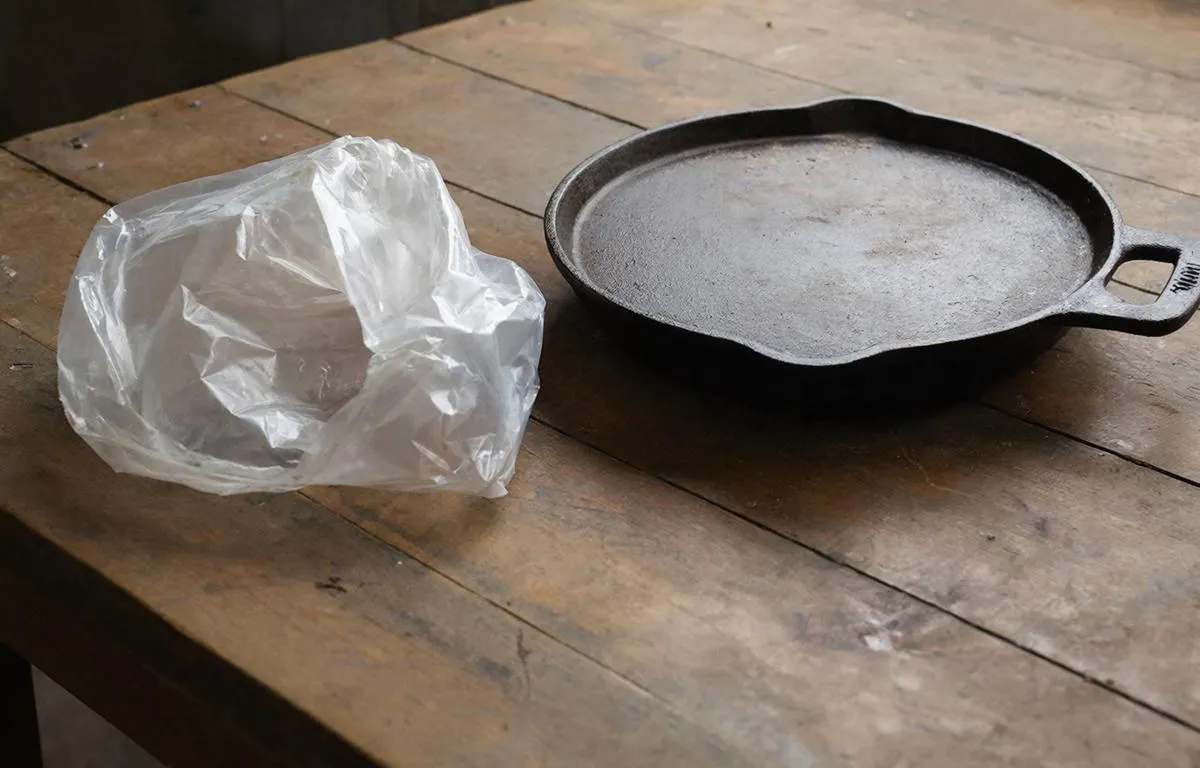 Сотрите крупные остатки еды бумажным полотенцем — мокрые поверхности ухудшают проникновение паров. Возьмите плотный пакет для продуктов объёмом 5–10 л, чтобы сковорода помещалась дном к пакету. Налейте 70 мл нашатыря на дно, не касаясь посуды, — жидкость сама испарится.